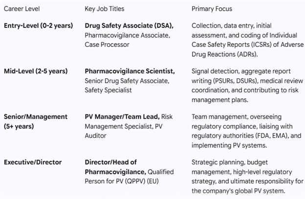 - Diverse Roles: Opportunities exist for both freshers and experienced professionals in roles like Drug Safety Associate (DSA), Pharmacovigilance Scientist, Medical Reviewer, and PV Manager.