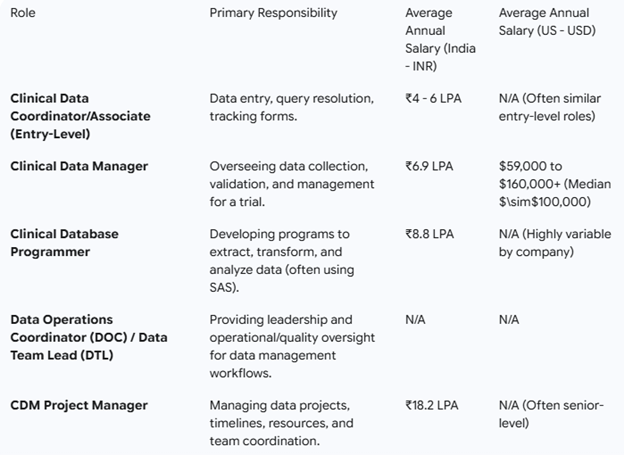 •  A career in Clinical Data Management (CDM) offers diverse and growth-oriented opportunities within the pharmaceutical, biotechnology, medical device, and Contract Research Organisation (CRO) sectors. The career path typically progresses from entry-level coordination to strategic, senior management roles.